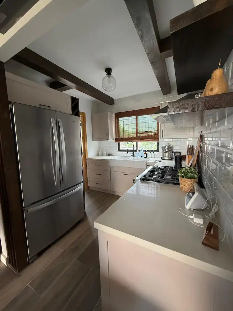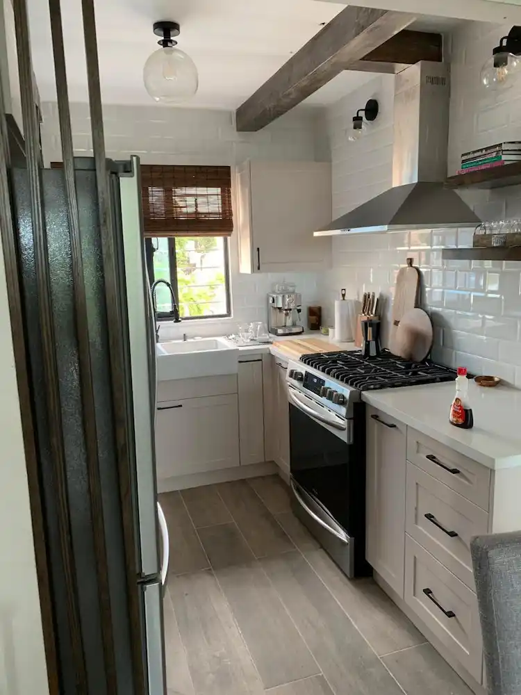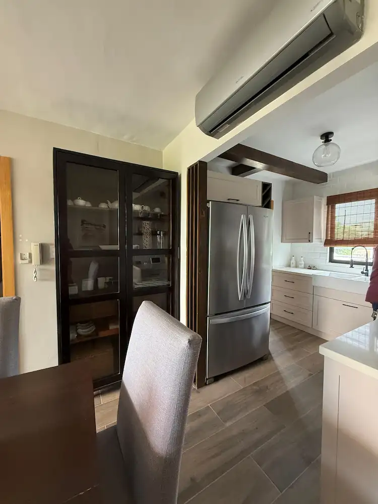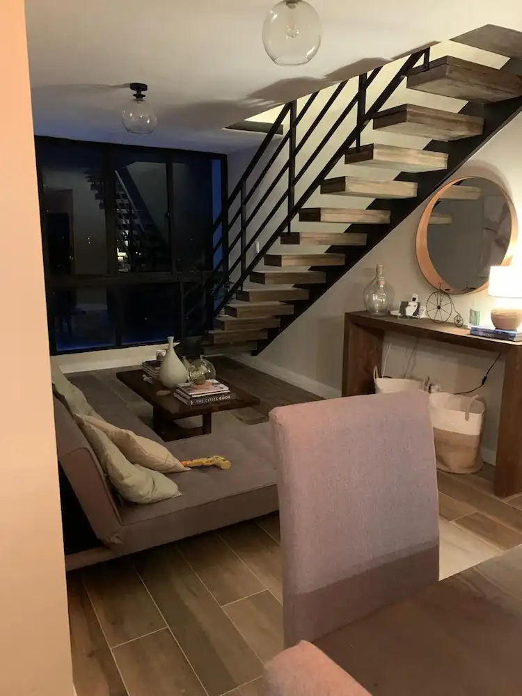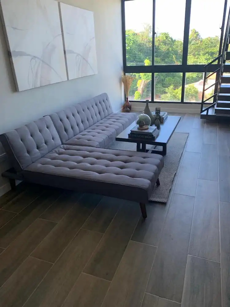 Este apartamento cuenta con una cocina con madera preciosa. El piso interior es de porcelanato.